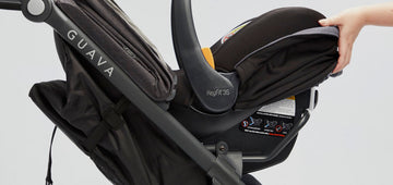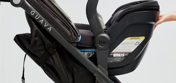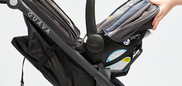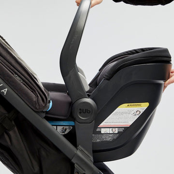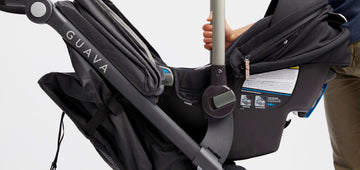 Lower the car seat, making sure it's facing toward the back of the stroller, onto the adapter and press down firmly until you hear a loud 'CLICK' indicating the car seat is safely installed.
