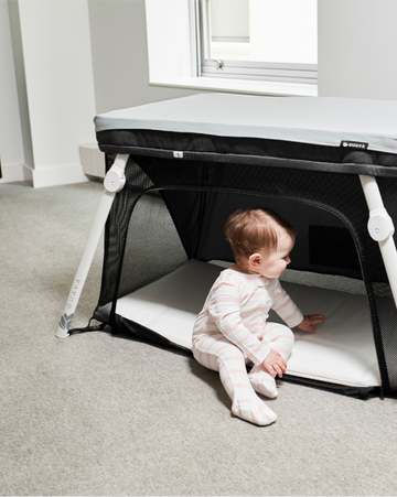 Use the shade in any situation where you’re trying to darken the sleeping area in the Lotus for nap time in a bright area, on a beach or in a hotel room. When you use the Nap & Fun Shade in the sun, it provides maximum protection with UPF50+. The Nap & Fun Shade baby sunshade is machine washable and constructed out of 100% quick dry polyester.